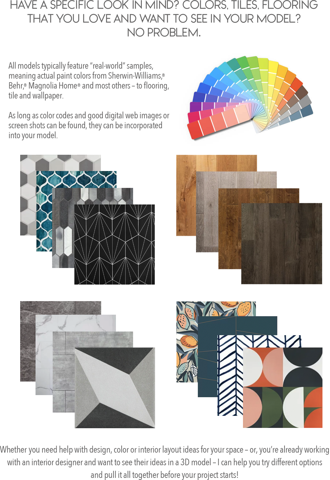 Try different materials, tiles, colors flooring and see it in a 3D Model first!